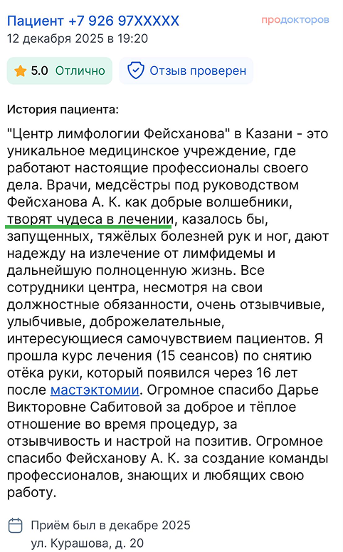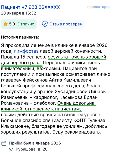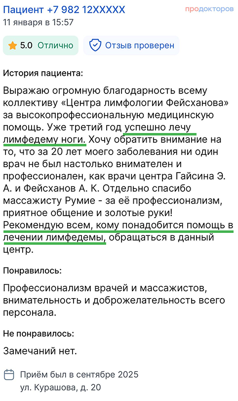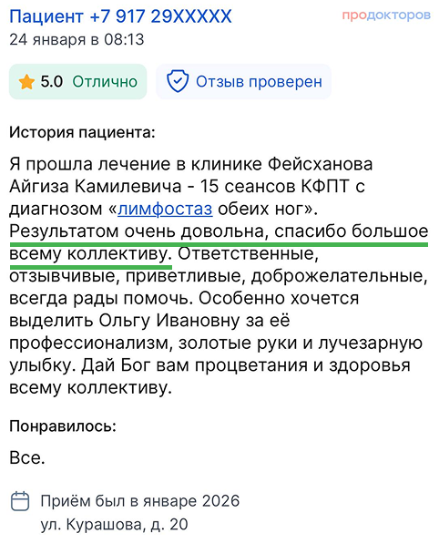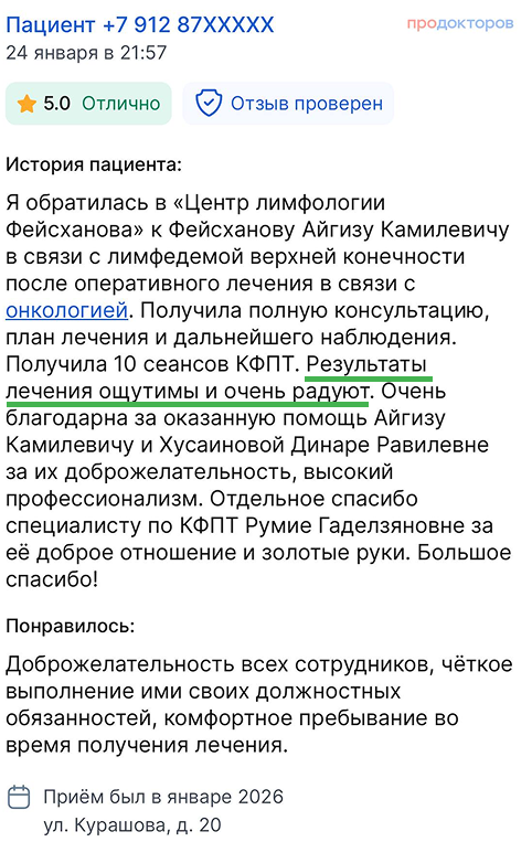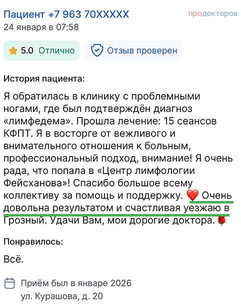 "Центр лимфологии А.К.Фейсханова" с 2014 года помогает пациентам с лимфедемой и хроническими отёками. Мы работаем по международной методике комплексной противоотёчной терапии, выстраиваем индивидуальные планы и сопровождаем пациентов до устойчивого результата.